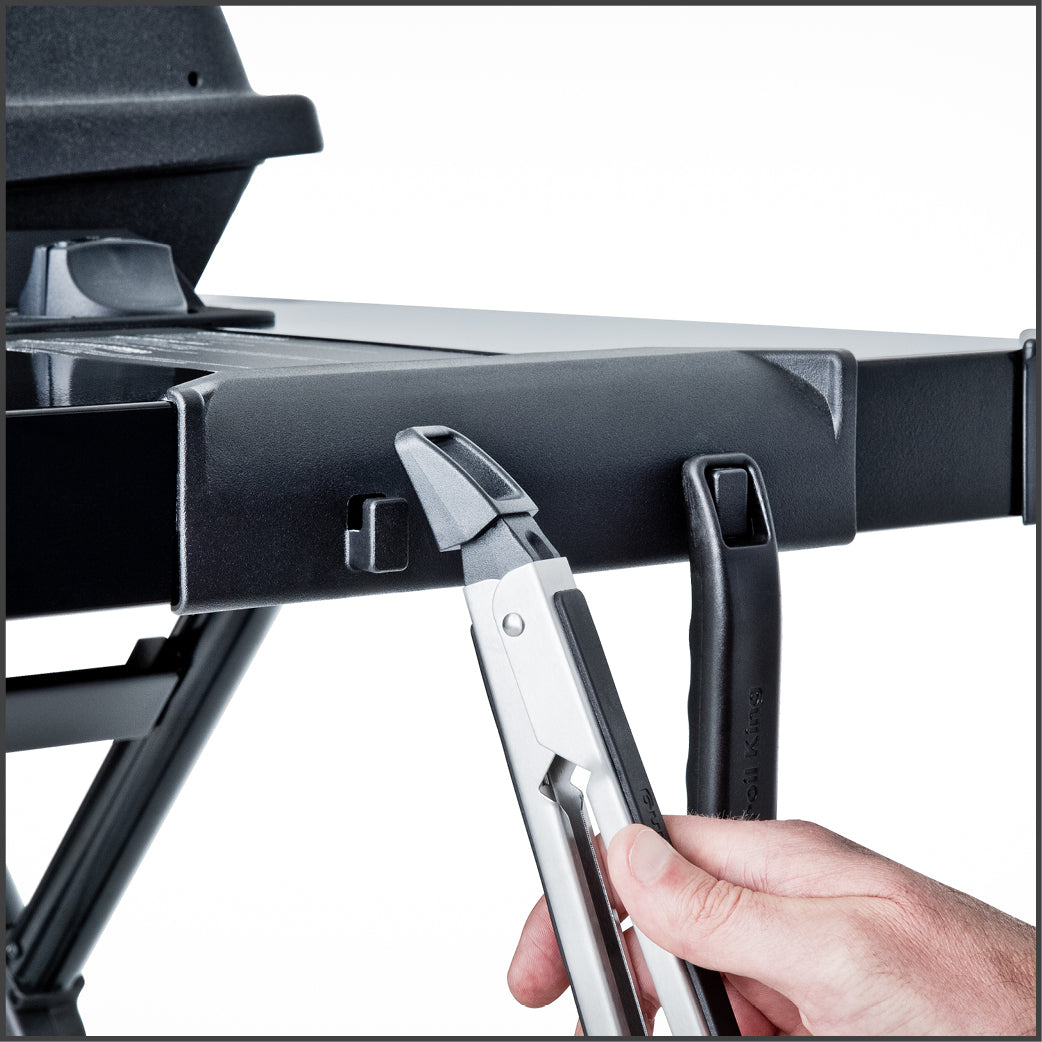 - Side Shelves: Black painted shelves with integrated tool hooks for convenience.