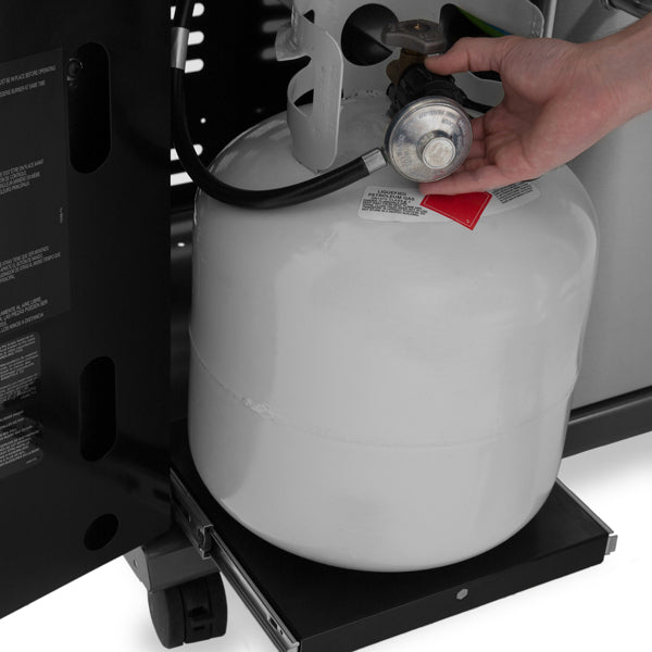 - Propane (LP): Designed for use with a 20 lb. tank (not included), featuring a pull-out tank drawer for convenience.