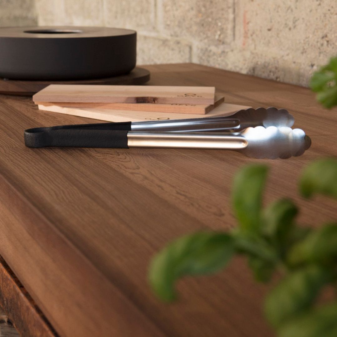 Expertly crafted from durable stainless steel with a sleek black finish, these OFYR® tongs boast an ergonomic design for effortless use. With a curved shape, they can rest on a countertop or be hung for storage.